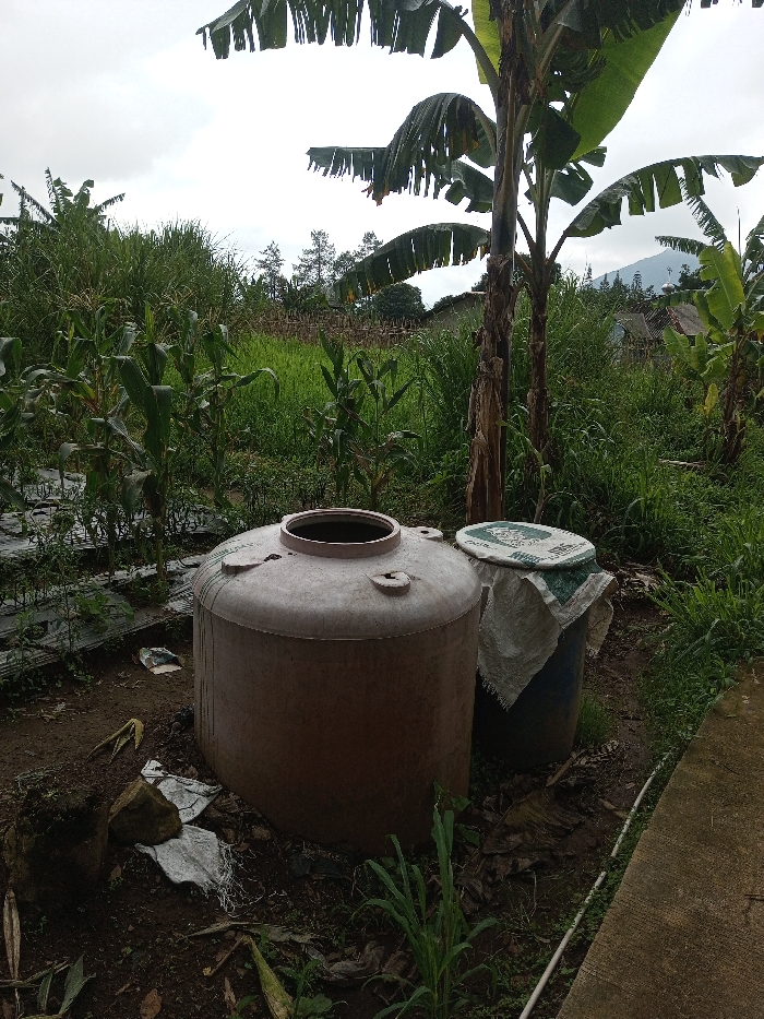 This image depicts an outdoor agricultural scene in Kondha, India, under an overcast sky. In the foreground, a large, cylindrical, tan plastic water tank, approximately 1.5 meters tall, stands on loose brown earth. Its domed top features an open circular access port and several smaller, sealed protrusions. To the right of this tank, a smaller blue barrel, roughly 0.8 meters tall, is partially visible, covered by a white and green burlap sack bearing the text "BIYAN." The ground around these objects includes sparse green vegetation, dry leaves, scattered white fabric, and small rocks. A narrow concrete edge runs along the lower right of the frame. The midground features an agricultural plot with rows of young corn stalks, some emerging from black plastic sheeting used as mulch. Tall green grasses and weeds are interspersed throughout this area. Several banana trees with large, drooping leaves are prominent, with one tree featuring a thick, textured trunk positioned slightly right of center. The background reveals a rudimentary fence constructed from vertical wooden sticks. Beyond this, dense green foliage, distant trees, and indistinct structures are visible. A faint outline of mountainous or hilly terrain is present on the horizon beneath the cloudy sky. No individuals or active human interventions are depicted in the scene.