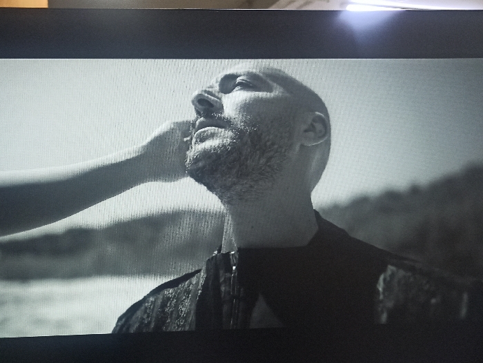 A black and white close-up depicts a man with a shaved head and beard looking upward. An arm and hand reach into the frame, appearing to touch his face. He wears a dark jacket or shirt. The background is blurred, showing a landscape with water and indistinct shapes that could be hills or mountains. The lighting creates a stark contrast, emphasizing the man's profile and the hand's presence.