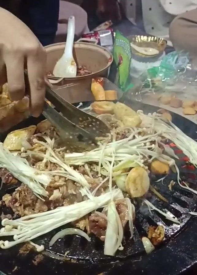 close-up of a person using tongs to stir and cook food on a round, black, sizzling grill. The food includes sliced beef, enoki mushrooms, onions, and other unidentified items. Steam rises from the grill. Various containers of food items surround the grill, including a pot, a plastic container with what appears to be fried food, and a bag of green sauce. Several people sit around the grill, but their faces are not visible. The overall setting seems informal, possibly an outdoor gathering.