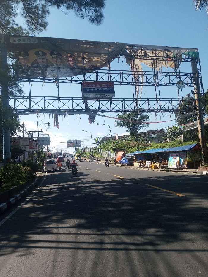 The image depicts a daytime street scene in the city of Niz Lakuk, India, under a clear blue sky. A prominent, large, metal-framed billboard structure spans across the asphalt road in the upper midground. The billboard's banners are severely torn and tattered; a fragment on the left displays portraits of at least four men in military or police uniforms. Below this, a smaller rectangular sign reads "WARNA" with "53677322 JUJUR PASTI." The road, appearing to have multiple lanes, features a mix of traffic, including several motorcycles, a white van, and other cars moving in both directions. One person in an orange vest is visible near the rear of the white van on the left side of the road. Shadows from overhead trees and the billboard structure fall across the foreground pavement. On the right side of the road, several makeshift vendor stalls are set up along the curb, covered by blue and orange tarpaulins. Goods are displayed on tables in front of these stalls, and a light blue pickup truck is parked nearby. Figures are visible near these stalls. The roadside environment includes green foliage, utility poles with power lines, and distant buildings on a slight incline behind the stalls. Streetlights are mounted on poles along the road.