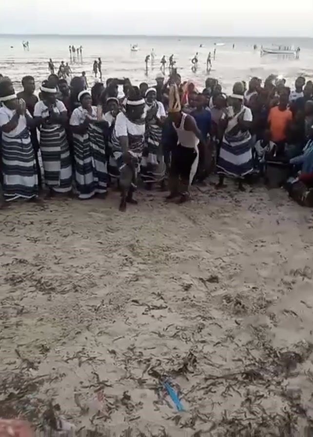 group of people dancing in a circle on a sandy beach. The dancers in the center are wearing white tank tops and dark shorts, with one wearing an elaborate headdress made of woven material and feathers. Those circling the dancers are dressed in white shirts and striped skirts or sarongs, with many wearing white headscarves. The dancers perform coordinated steps, with the group clapping along to the rhythm of drums being played off-screen. In the background, the ocean is visible with several small boats floating on the water, and additional people are standing or wading in the shallow water. The beach appears to be covered in seaweed and debris, and the sky is overcast, suggesting either early morning or late afternoon.
