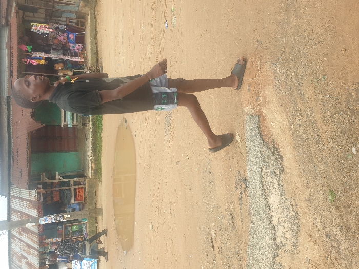 The image captures an outdoor street scene within the city of Aba, Nigeria. The foreground is dominated by an unpaved, reddish-brown dirt and gravel road surface, broken by a section of deteriorated gray asphalt pavement. A young, slender male, estimated to be adolescent, walks from the right to the left side of the frame. He wears a black short-sleeved polo shirt, light-colored shorts with dark patterns, and dark slide sandals. His right hand is partially raised towards his neck. In the midground, a substantial, irregularly shaped puddle of muddy water is present on the unpaved ground. To the left of the puddle, another individual, dressed in dark clothing and carrying a shoulder bag, walks away from the viewer. A utility pole, adorned with various papers or posters, stands vertically on the far left. The background consists of a continuous row of single-story commercial structures, likely small shops. These buildings feature corrugated metal roofs, some exhibiting rust. Their facades vary, including a prominent turquoise-green painted wall and exposed wooden elements. Merchandise, such as colorful textiles and plastic items, is displayed visibly outside these establishments. Additional figures are faintly discernible within or near the background shops. The overall lighting suggests an overcast or muted daylight condition.