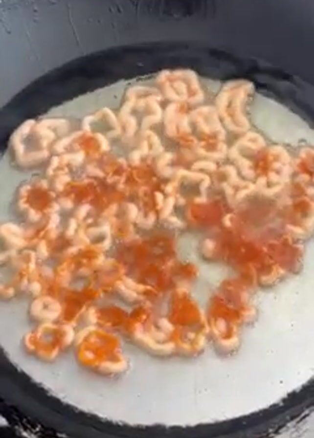 food frying in a large, wok-like pan. The food items are small, round shapes with a hole in the center and appear to be white and orange in color. Bubbles can be seen in the oil as it fries, and some steam rises from the hot pan. The pan itself looks worn, with a slightly stained or tarnished metallic surface. The overall setting appears to be a kitchen or food preparation area.