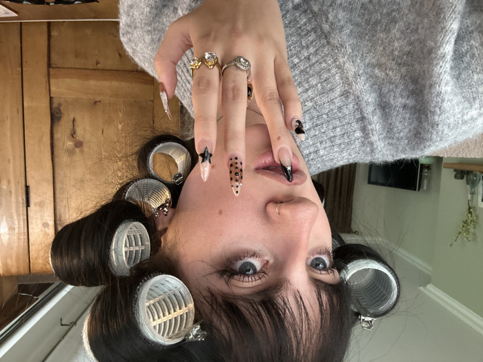 An individual is depicted in an indoor setting within North Hertfordshire, United Kingdom. The subject is a female with dark hair, bangs, and blue eyes, looking directly forward. Her hair is styled with multiple large, silver-toned hair rollers secured by clips. She wears a light grey knitted sweater. Her left hand is raised, with the index finger lightly touching her lower lip. This hand displays long, pointed acrylic nails featuring intricate black and white designs, including polka dots, stars, and French tips. Multiple rings are visible on her left hand: a silver-toned ring on the index finger, a gold-toned ring with two clear stones on the middle finger, and a gold-toned ring with a dark stone on the ring finger. A thin nose ring is present in her right nostril. The background on the left includes a light-colored wall, a television screen, and a shelf with a vase and foliage. The background on the right consists of a vertical wooden plank wall or door.