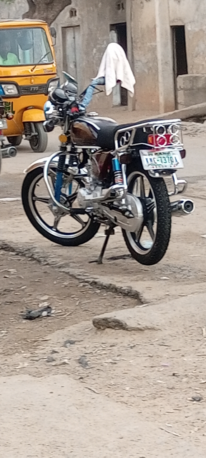 A parked motorcycle takes center stage, its rear facing the camera. A yellow "keke napep" tricycle is partially visible to the left. The bike is equipped with chrome accents, a dark seat, and a license plate reading "KMC-1370A." A white cloth is draped over the handlebars. The setting appears to be a residential street, with a weathered building in the background and an uneven dirt surface in the foreground.