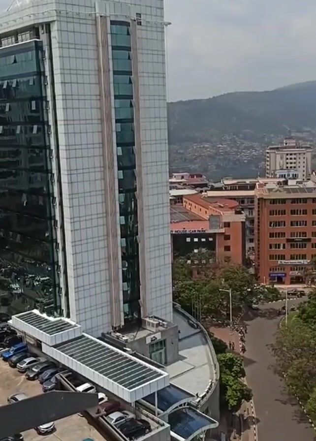 n urban landscape, presumably the downtown area of a city. Tall, modern buildings with glass and metal facades dominate the scene. The camera pans across a cityscape featuring a roundabout with cars and pedestrians. In the distance, mountains can be seen. The overall atmosphere is urban and populated, with a blend of modern architecture and natural elements.