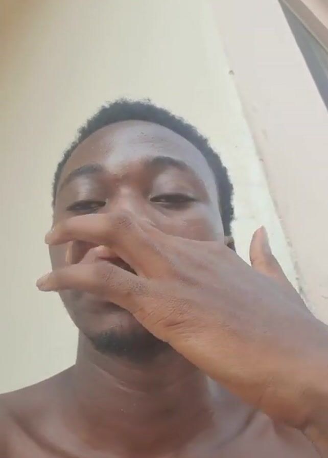 close-up of a dark-skinned man with short, dark hair and a short beard. He is shirtless and appears to be sweaty. He looks directly at the camera, then turns his head to the right. The background is a light-colored wall with a window frame visible in the upper right corner. There is a musical soundtrack playing.