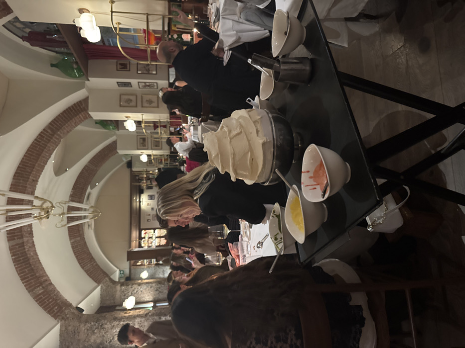 The image depicts an indoor restaurant scene in Milan, Italy, characterized by a vaulted ceiling with exposed brick arches and white plaster. The ambient lighting is warm, provided by ornate brass chandeliers with multiple white tube-like lights and wall-mounted sconces. The decor includes framed pictures on the walls and shelves holding glass bottles and vases, some red and green. In the foreground, a black, collapsible side table displays a large metal serving bowl containing a towering swirl of white gelato or ice cream. Surrounding it are several smaller white bowls: one with a yellow topping, another with an orange/pink topping (with drizzles down the side), and a third with a green topping. A metal ice cream scoop is visible in a cylindrical holder. Numerous patrons are seated at tables with white tablecloths throughout the restaurant. On the left side, the back of a woman with long dark hair is visible, wearing a dark, possibly lace, top. Seated at a table further back and to her right is a blonde woman in a black top, looking towards the right side of the frame. A young man in a light brown jacket stands in the background on the left. On the right side, a bald man in a black shirt is seated at a table, gesturing with his right hand as he looks towards a person off-frame. Other diners, mostly out of focus, occupy tables across the establishment, engaged in dining and conversation. White wine glasses are present on the table in the mid-ground. The floor appears to be dark wood.