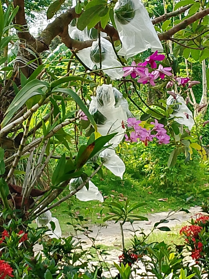 This image depicts a detailed outdoor horticultural scene in Gadingrejo, Indonesia. A prominent tree, likely an avocado, features multiple unripe fruits, each individually enclosed within a translucent white plastic bag for protection, hanging among its green leaves. Interspersed among the tree's branches are several orchid plants, displaying clusters of vibrant purple flowers and elongated green foliage. Dense green vegetation, including smaller plants with bright red blossoms, occupies both the foreground and background, framing a light-colored, unpaved pathway visible in the mid-ground. The scene is illuminated by natural daylight. No individuals are present.