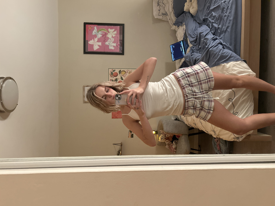 A young woman stands in front of a mirror, taking a selfie. She wears a white tank top and plaid pajama shorts. The background features a bed with a blue comforter, a laptop, artwork on the wall, and a shelf with decorative items. The mirror frame is visible, adding depth to the image.