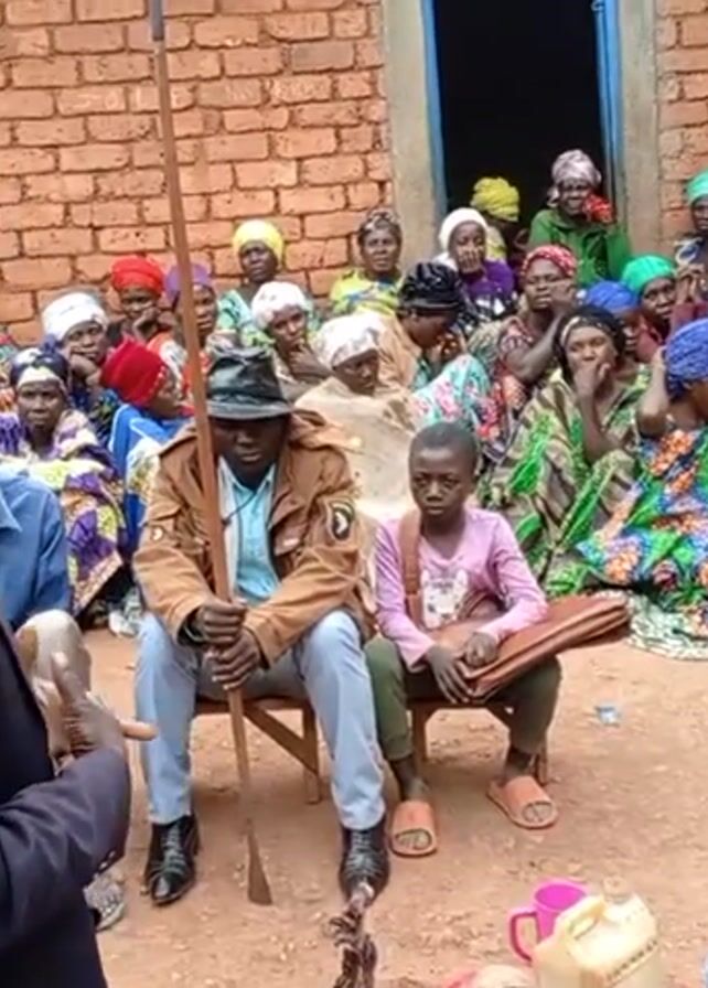 gathering of people, mostly women, sitting outside a brick building. A man in a suit stands in front of the group and appears to be addressing them, gesturing with his hands. The women are wearing colorful clothing and headscarves, and some are holding children. There are a few men among the group, sitting on benches. In front of the speaker are a few objects, including a pink pitcher, a jug, and a blue cup. The environment suggests a rural or village setting.