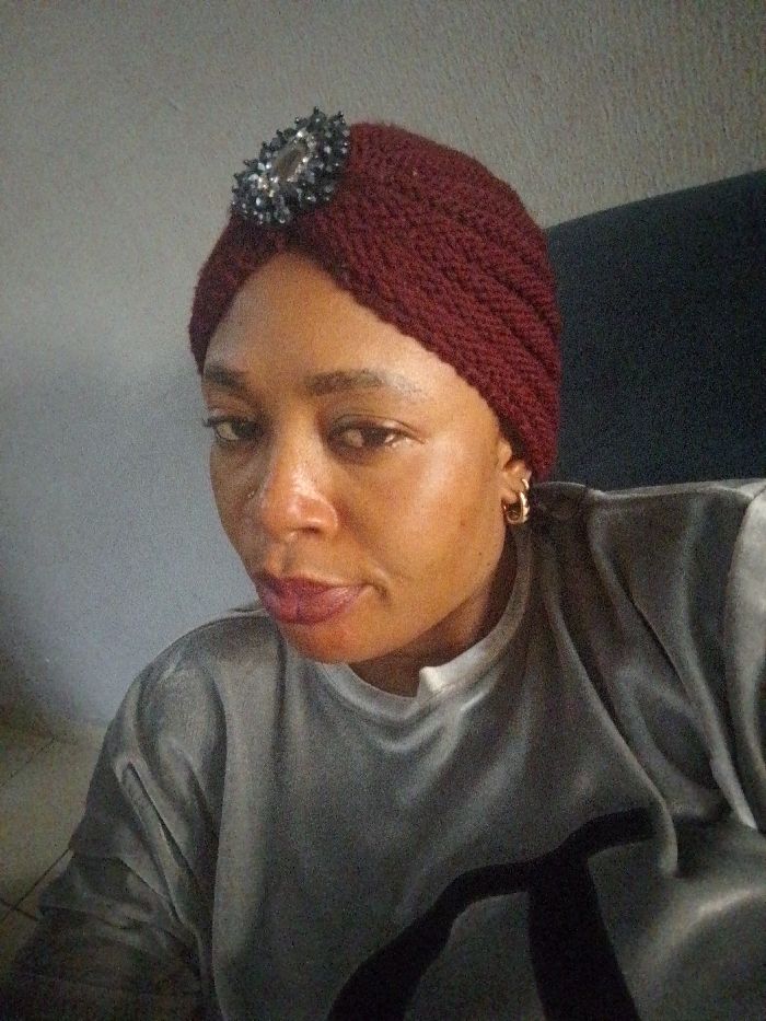 This image depicts a close-up, slightly high-angle portrait of an adult female. The location is an indoor setting within the city of Unknown, Unknown. The subject is a female with dark skin, facing forward with a direct gaze towards the camera. She has visible makeup, including eyeliner and lip color. Her hair is completely covered by a maroon or dark red knitted turban, which features an ornate, oval-shaped embellishment centered on the front. This embellishment consists of dark, faceted beads surrounding a central silver-toned, possibly gemstone, element. She is wearing small, gold-colored hoop earrings in both ears and has a piercing on her right nostril. Her attire includes a light gray, long-sleeved top with a subtle sheen, possibly velvet. A dark, indistinct shape or pattern is present on the lower right portion of her shirt. The background on the left side is a light gray, textured wall, while the right side shows an indistinct dark surface. The lighting appears to be internal, highlighting her features. No other individuals or significant objects are present. The subject is stationary, posing for the camera.