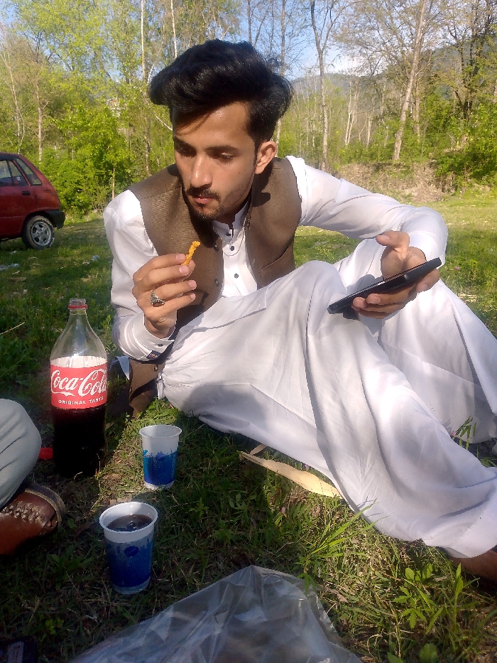 A young adult male, of apparent South Asian ethnicity, with dark styled hair and a short beard, is seated on lush green grass in an outdoor setting in Janu Mandi, Pakistan. He wears a white shalwar kameez and a brown waistcoat. On his right hand, a ring with a dark stone is visible on his index finger. He holds a yellow, twisted snack item in his right hand, positioned towards his mouth, and a black smartphone in his left hand. To his left, a partially consumed 1.5-liter plastic bottle of Coca-Cola stands upright, uncapped, next to a white plastic cup adorned with blue patterns, containing a dark liquid. A second similar cup with dark liquid is positioned closer to the foreground. The lower leg and a brown laced shoe belonging to another individual are visible in the bottom left corner. A clear plastic bag is partially visible on the grass in the bottom right. In the background, a small red compact car is parked amidst abundant green trees. Distant mountains are visible beneath a bright, clear sky.