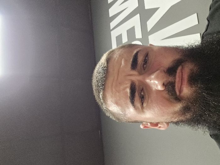 A male individual with a short dark buzz cut and a full, dark beard is depicted in a close-up, head-and-shoulders shot
