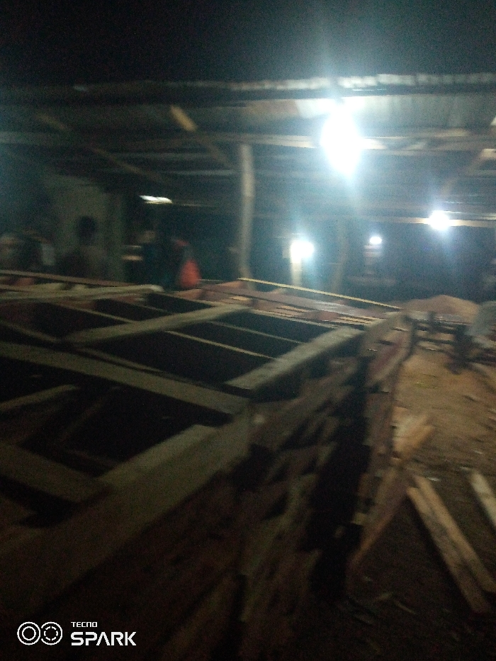 Inside a dimly lit warehouse, a boat's skeletal wooden frame dominates the foreground. The crisscrossing beams and empty rectangular spaces evoke a sense of incomplete construction. Faint figures, likely workers, are discernible in the background amidst scattered lumber. Overhead, harsh, bare bulbs provide the only illumination, casting stark shadows and creating a somewhat industrial atmosphere. The "TECNO SPARK" watermark is visible at the bottom.
