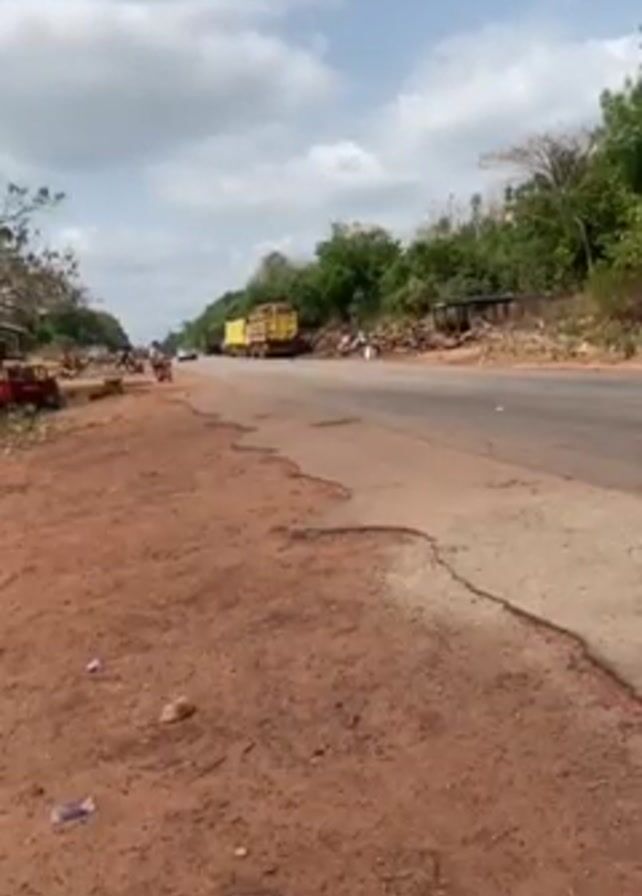 roadside scene under a partly cloudy sky. The foreground features a dirt road bordering a paved road. On the paved road, vehicles, including a silver SUV and yellow trucks, are visible. The SUV is moving towards the camera. A motorcyclist is visible on the opposite side of the road. Trees and other vegetation line the roadside and background.