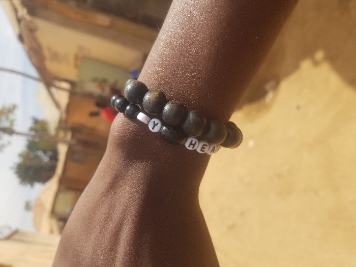 A close-up, outdoor daytime image depicts a dark-skinned forearm in the foreground, centrally positioned, extending horizontally from left to right. Two beaded bracelets adorn the wrist. The upper bracelet comprises small, spherical black beads interspersed with flat, circular white beads bearing black letters, which spell "YHEA" (with the 'Y' partially obscured). The lower bracelet features larger, spherical, dark brown or black beads, consistent with natural wood. The skin texture of the forearm is clearly visible. The background, out of focus, reveals a light brown, dry earth ground surface. Beyond this, a semi-urban or village environment in Jos, Nigeria, is visible. It consists of multiple single-story structures with light-colored walls; some roofs are thatched or composed of natural materials, while others appear darker, possibly corrugated. Scattered trees with green foliage are present. A blurry figure in a red garment is partially visible in the mid-ground, near the buildings. The sky is light blue and clear, indicating a sunny day with natural illumination. No explicit actions or interactions are depicted beyond the static presentation of the arm and bracelets against the environmental backdrop.