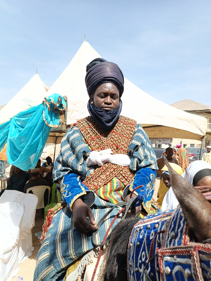 A man in traditional attire is seated on a horse at an outdoor gathering in Gwagwarwa, Nigeria, under a clear blue sky