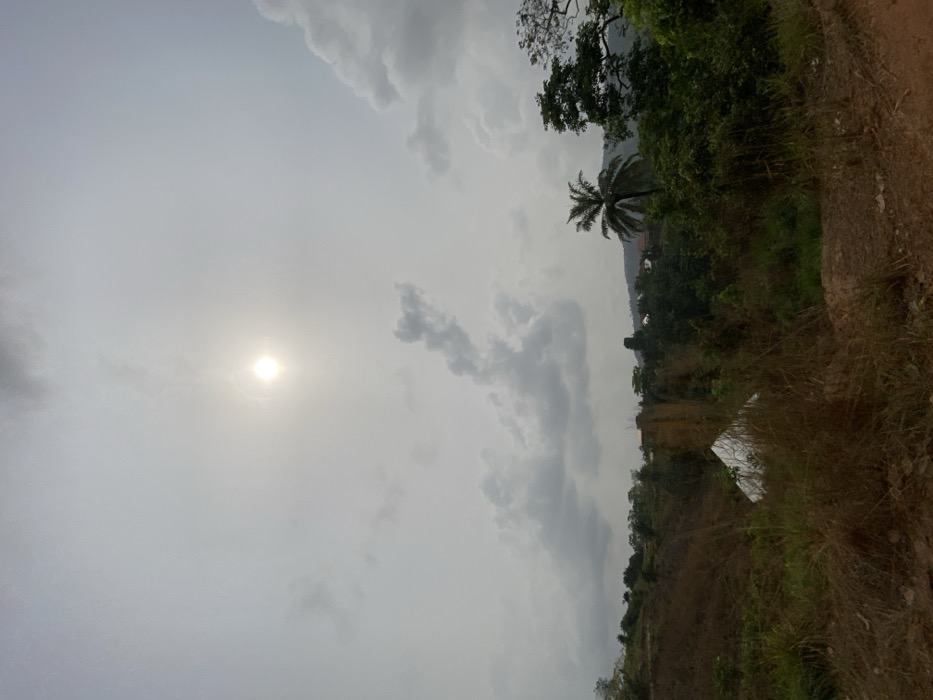 The image displays an outdoor landscape located in Achara, Nigeria. The scene is illuminated by a bright, diffuse sun visible through a heavily overcast sky composed of various grey clouds. The foreground consists of reddish-brown earth and dry, tan-colored tall grasses, interspersed with some greener vegetation. In the midground, the terrain slopes downwards, covered by dense green foliage. A distinct white, triangular or pyramidal structure, possibly a tent or temporary shelter, is partially visible nestled within a vegetated depression on the left side. To the right, a solitary palm tree with prominent fronds stands amidst other dense green trees and shrubs. The background reveals a series of undulating hills covered in vegetation, with scattered, indistinct structures partially visible within the distant landscape. No individuals, animals, or specific actions are discernible within the frame.