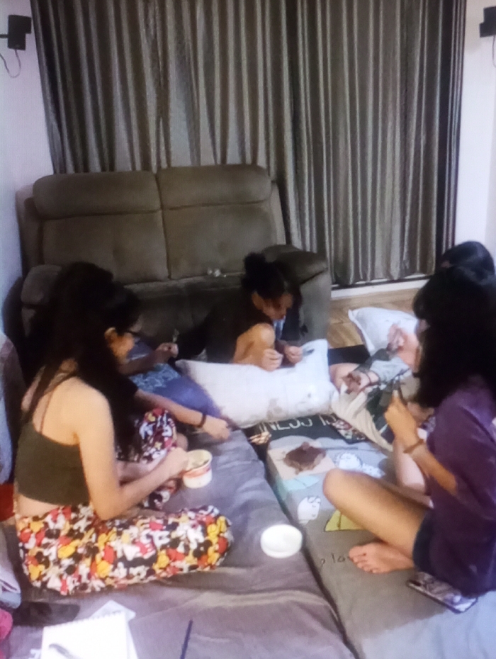 The image depicts four individuals within an indoor residential environment. Visual analysis does not provide sufficient data to confirm a specific location within Wrocław, Poland. The background features a dark upholstered two-seater sofa positioned against a wall entirely covered by vertical, pleated grey curtains. To the left, a light-colored wall is visible with a dark rectangular fixture mounted high. The four individuals, all appearing to be young females, are seated or reclining on the floor, which is covered by an arrangement of grey blankets and thin mattresses. One mattress section features a light-colored, repetitive graphic pattern. Specific details regarding the individuals and their activities: 1. In the left foreground, a female with long, dark hair, dressed in an olive-green crop top and multi-colored pajama pants featuring a Mickey Mouse motif, is seated cross-legged. She holds a white plastic container and a spoon, actively consuming its contents. 2. In the center-background, a female with dark hair, wearing a dark top, is partially visible. She is seated or reclining, apparently engaging with a small object held in her hands. 3. In the right-center, another female with dark hair, tied back, reclines on a white pillow placed on the patterned mattress. She wears a dark top and is focused on a mobile electronic device she is holding. A brown, rectangular food item rests on the patterned mattress nearby. 4. In the right foreground, a fourth female with long, dark hair, wearing a purple t-shirt and dark shorts, is seated cross-legged, displaying bare feet. She is attentive to a mobile electronic device in her hands. A small white bowl is present on the mattress beside her, and an additional mobile phone lies flat on the mattress near her right leg. The individuals are independently engaged in casual activities, primarily eating and interacting with personal electronic devices. No direct interpersonal interactions are visually indicated.