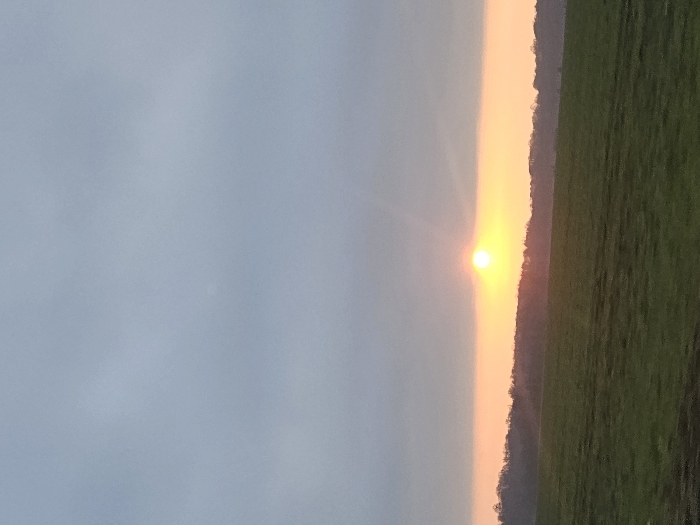 The image displays a rural landscape scene in Orcemont, France. The upper two-thirds of the frame show a light blue-grey sky, indicative of overcast or hazy conditions. A prominent, bright yellow-orange sun is positioned low on the horizon, slightly to the left of the image's vertical center, casting a horizontal band of orange and pink light across the immediate horizon. Below this illuminated band, a dark, silhouetted line of trees or a forest is visible. The lower third of the image is occupied by a gently sloping green field. No individuals, animals, specific man-made objects, or discernible actions or interactions are present within the scene. The lighting suggests either sunrise or sunset.