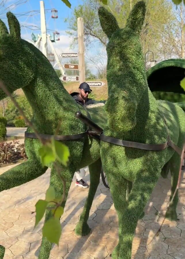 pair of horse-shaped topiary sculptures hitched to a small carriage in what appears to be an amusement park or outdoor attraction