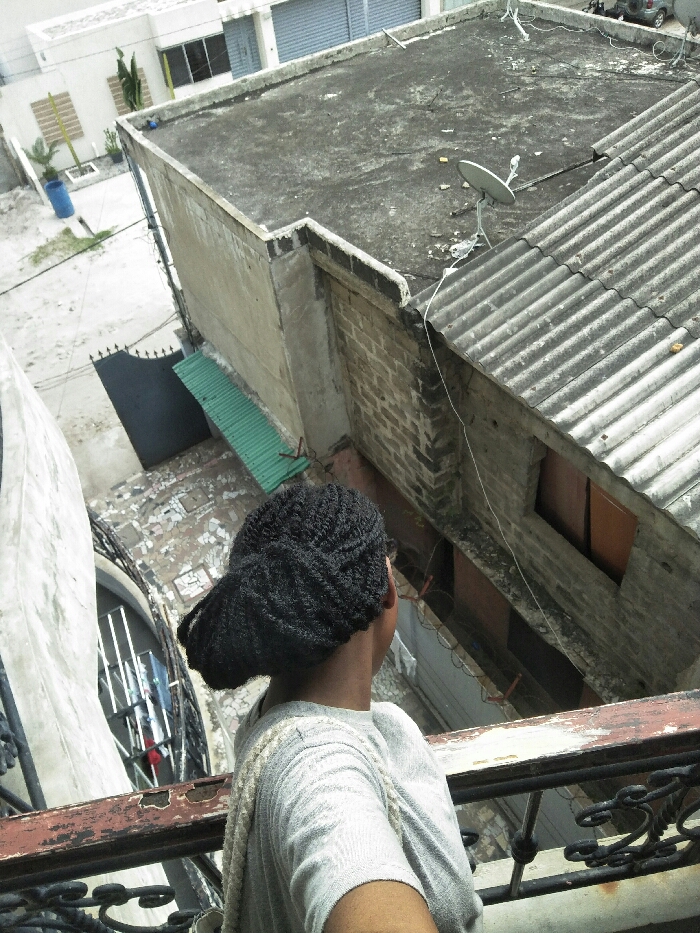 A high-angle, forensic view captures an urban scene in Cotonou, Benin, observed from an elevated balcony. In the immediate foreground, the back of an individual is visible, wearing a light grey top and having dark, braided hair styled into a bun. A light-colored strap is draped over their left shoulder. The individual is positioned at a dark, ornate metal balcony railing with a weathered reddish-brown wooden handrail. Below the balcony, a multi-story building dominates the midground. Its exterior walls are constructed of rough, discolored concrete and exposed brick. A flat, dirty concrete rooftop is visible on a lower section of this building, featuring a small, white satellite dish. Adjacent to this, a steeply sloped, corrugated gray roof extends downwards. Several rectangular window openings on the building's side facing the viewer are fitted with closed or boarded-up reddish-brown wooden shutters. Below these windows, segments of barbed wire are affixed to the wall. A green corrugated metal awning or lean-to structure is visible at a lower elevation on the building's side. The ground level below the immediate structures appears unpaved and strewn with debris, including broken concrete or tiles. A dark metal gate is visible, possibly leading to an alley or courtyard. In the further background, lighter-colored buildings with security features like window grilles and roll-down shutters are observed. A blue barrel stands near one of these structures, and sparse vegetation is present. A vehicle is partially visible in the far upper-right background. Overhead, utility wires traverse the scene.