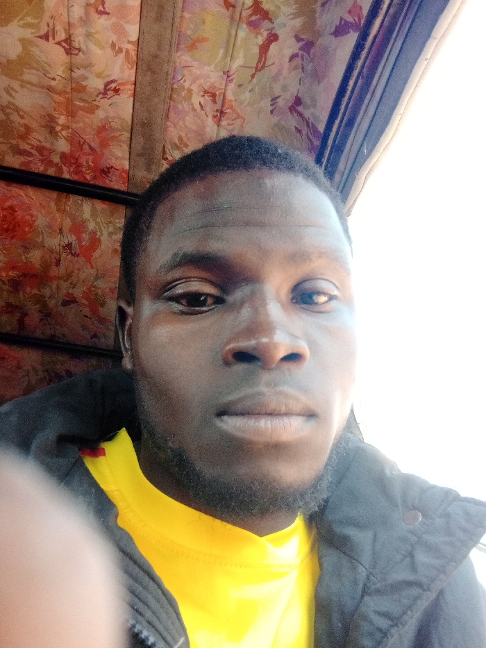 The image presents a headshot of a dark-skinned male with short dark hair and a short beard, facing forward with a neutral expression