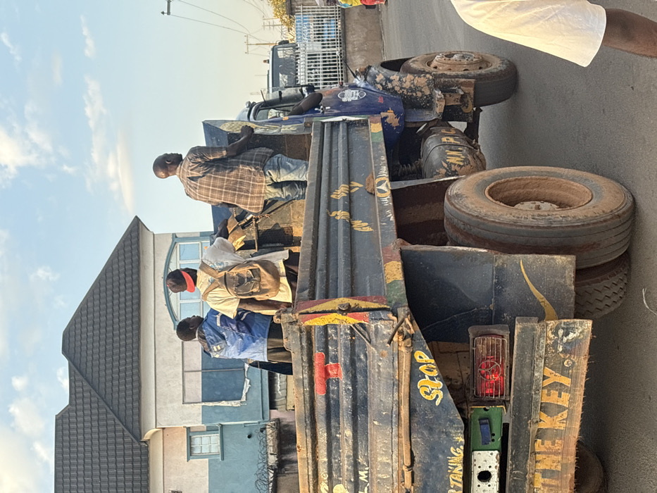 The image captures a blue, heavily soiled Mercedes-Benz utility truck moving on a paved road in Jos, Nigeria, under a clear sky with scattered clouds