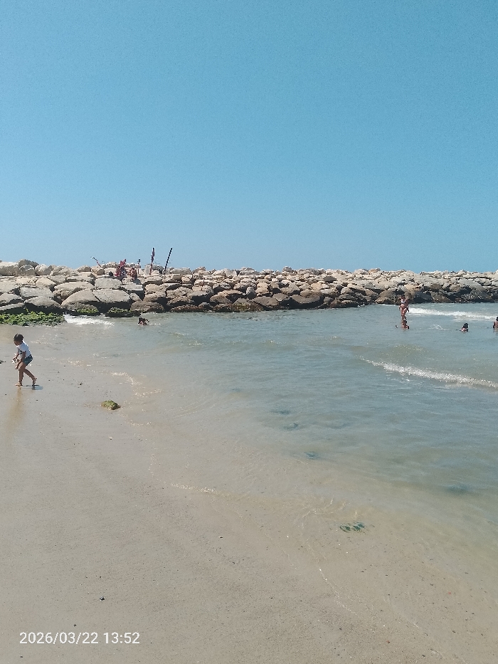 The image depicts a daytime beach scene in Caraballeda, Venezuela, under a clear, bright blue sky. The foreground features light-colored sand and shallow, clear ocean water with gentle waves. A young child, wearing a light-colored top and dark shorts, walks barefoot on the wet sand in the lower-left. Several translucent, circular, disc-shaped objects, possibly jellyfish, are visible in the shallow water near the sand on the right. A substantial rock breakwater or jetty extends horizontally across the mid-ground, separating the foreground beach from the open water. Green algae growth is evident on some rocks at the base of the breakwater where it meets the water. Several individuals are present near and on the breakwater: one person stands partially submerged in the water on the right, another appears to be swimming or wading further out, and a group of approximately five to seven individuals are situated on top of the breakwater in the middle-left. At least two fishing poles are visible extending from this group on the breakwater. The timestamp "2026/03/22 13:52" is embedded in the lower-left corner of the image.