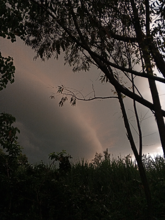 A low-angle shot depicts a dark, stormy sky, partially obscured by the silhouette of trees in the foreground. Tall grass and foliage line the lower portion of the image, with the landscape appearing muted and dimly lit. A subtle, brighter streak cuts through the storm clouds, offering a glimpse of the sky. The overall atmosphere evokes a sense of foreboding and somber natural beauty.