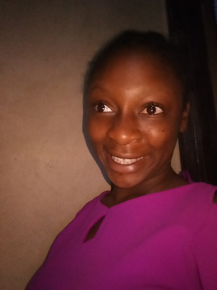 A smiling woman with dark skin and brown eyes poses in a low-light setting. Her hair is pulled back. She wears a magenta top with a small, teardrop-shaped cutout at the neckline. The background appears to be a plain, light-colored wall. The lighting is uneven, creating shadows on her face and the wall. She looks slightly to the side.