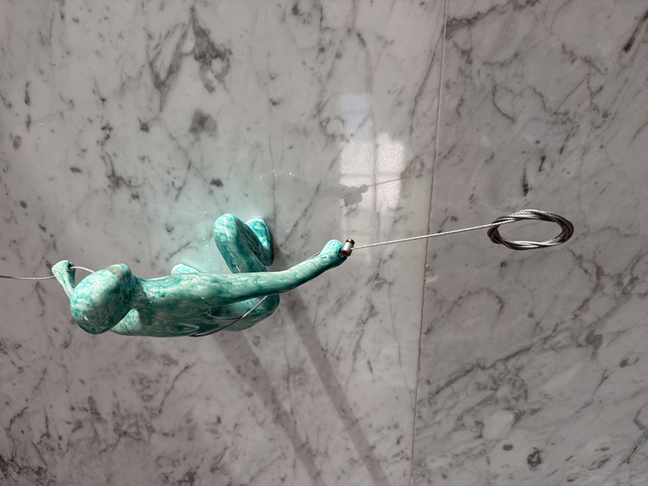 A humanoid art sculpture with a mottled turquoise and teal finish is suspended against a polished white marble wall with prominent gray veining, located in Huixquilucan de Degollado, Mexico. The figure is positioned in a semi-crouched, upward-facing posture, oriented towards the upper-left of the frame. Thin metallic cables facilitate its suspension; one cable extends upwards from the figure's cranial region, while a second descends from its right upper limb. The descending cable is secured at the figure's hand by a small, cylindrical metallic ferrule. The distal end of this cable is coiled into a tight, multi-strand loop. The marble wall displays visible horizontal panel seams. Strong, unidirectional lighting from the right casts distinct shadows of the sculpture and its cables onto the reflective marble surface.
