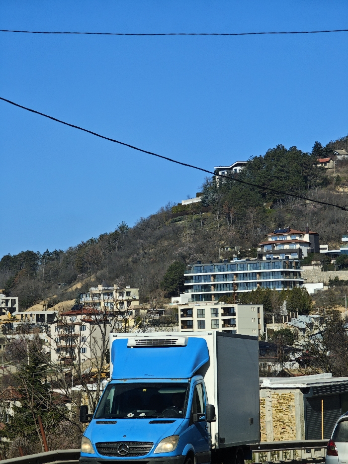 The image displays a daytime scene in Varna, Bulgaria, featuring a steep, developed hillside under a clear blue sky. In the foreground, the front-left portion of a light blue Mercedes-Benz Sprinter reefer truck is visible, positioned on what appears to be a road. The truck has a white refrigeration unit mounted above its cab and a gray cargo box. To the immediate right of the truck, a metal guardrail is present, and a partial view of a white vehicle's rear bumper is seen on the far right. The background consists of a tree-covered incline, populated by a mix of bare deciduous trees and evergreen conifers. Numerous residential buildings are distributed across the hillside, ranging from multi-story apartment complexes, some with modern glass balconies, to individual houses, including one prominent white structure with a curved roofline near the crest. Several buildings exhibit signs of ongoing construction, with exposed concrete frames. The clear blue sky overhead is bisected by two dark, diagonally running utility wires. No individuals or discernible actions are present in the scene.
