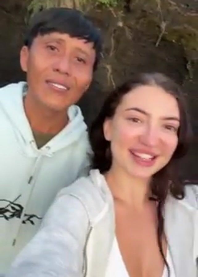 A woman and a man are taking a selfie video. They are both wearing hooded sweatshirts and smiling. The woman is wearing a white top underneath. The man is holding up a "shaka" hand sign. The woman is also making the shaka sign and sticking her tongue out. The background is dark, possibly a rock wall. The video is shaky and the camera is moving.