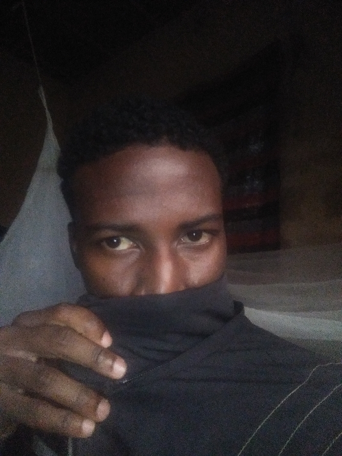 A close-up shot depicts a dark-skinned man with short, dark hair. He has light brown eyes and a serious expression. His nose and mouth are obscured by a black garment held up to his face. His hand is visible, holding the garment. The background is dark and indistinct, with some subtle patterns suggesting a wall or fabric. The overall lighting is dim, creating a somber mood.