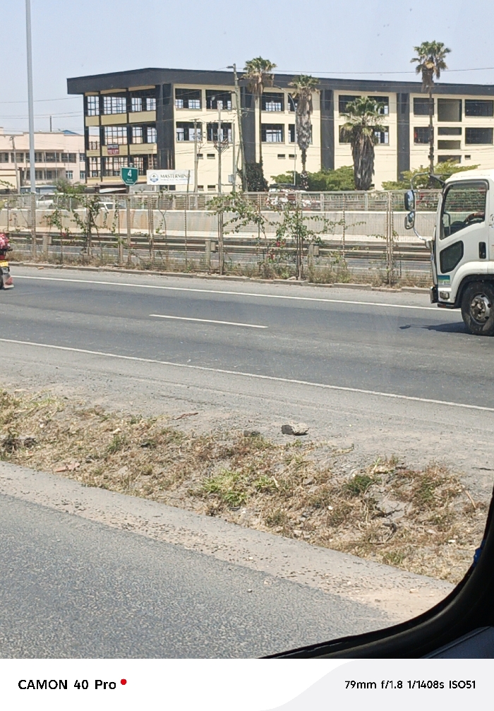 A sunny outdoor shot showcases a multi-story building with palm trees. A fenced divider separates the building from a road with sparse vegetation. A white truck partially enters the frame on the right, while a vehicle is visible on the left. The foreground features a close-up of the road surface and roadside weeds. The image appears to be taken from inside a vehicle due to the visible window frame at the bottom.