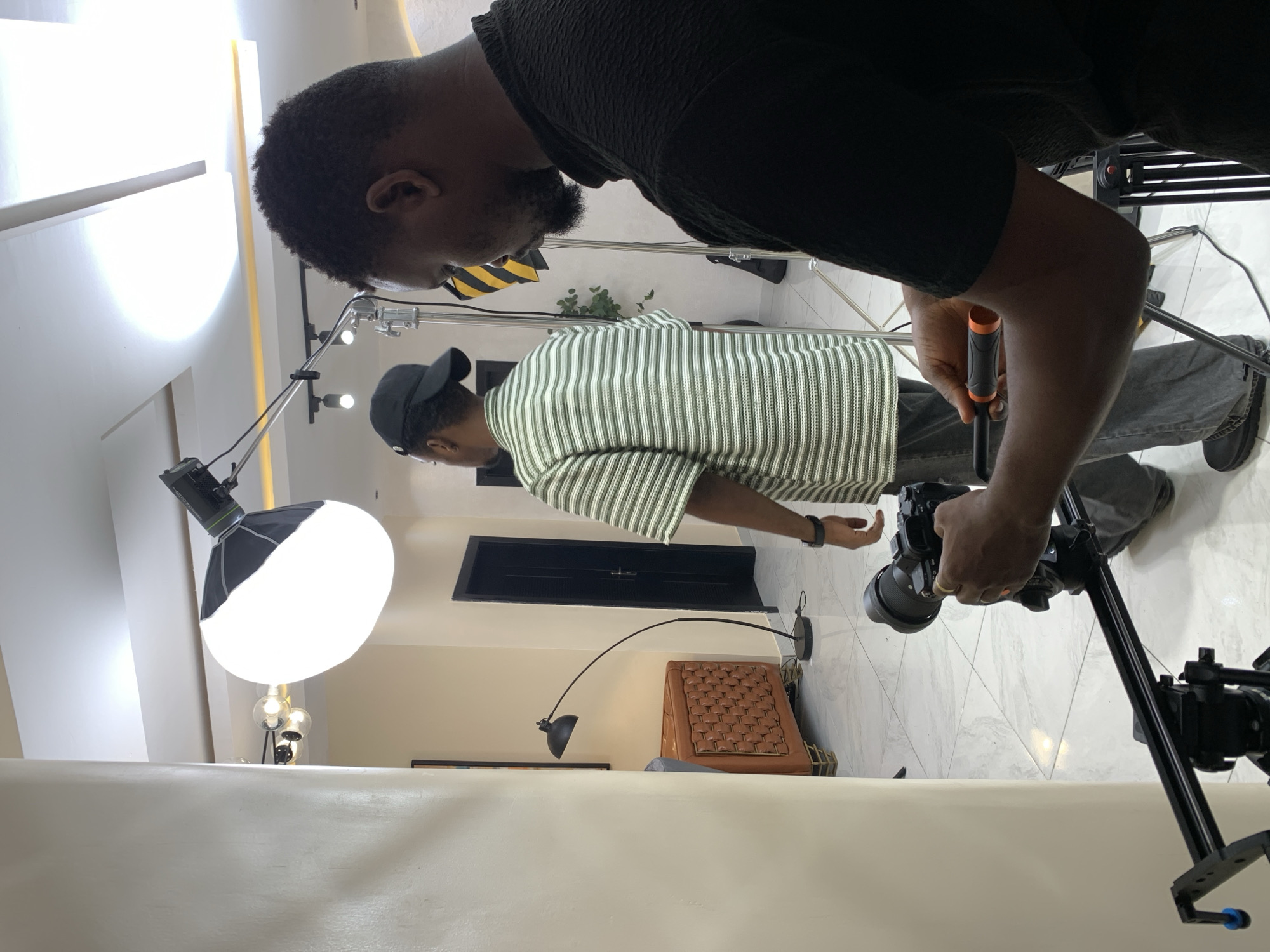 An indoor scene in Moba, Nigeria, depicts two males engaged in a video or photo shoot setup. In the immediate foreground, positioned to the right, a male with dark skin, short dark hair, and a beard is operating a black digital camera mounted on a camera slider rig. He wears a dark, textured short-sleeved top and grips an orange-handled control on the rig. To the left of the camera operator, a second male with dark skin, wearing a black baseball cap backward and a light green and white horizontally striped short-sleeved shirt, dark pants, and black shoes, stands facing away from the viewer towards the left. The environment is a modern, well-lit room featuring light cream-colored walls and a glossy white tiled floor with subtle gray patterns. A large, circular white softbox light on a stand illuminates the area from the mid-ground left. Behind the foreground operator, a light stand with a black and yellow striped reflector or flag is visible. To the left, a light brown, intricately woven-textured cabinet with gold-colored legs and a black arched floor lamp stand against a wall. A modern ceiling chandelier with multiple globe lights is present, and recessed lighting contributes to the bright illumination. Dark colored doors are visible in the background. A prominent light-colored structural column partially frames the left side of the scene.