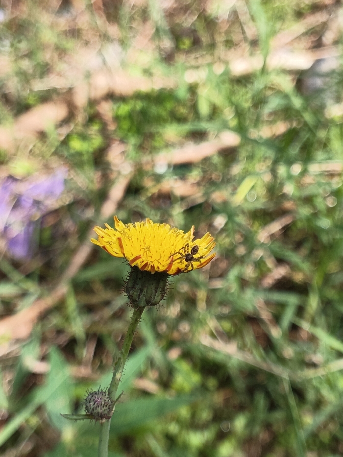 A vibrant yellow flower head is the central focus, its petals slightly ruffled and providing a perch for a small spider. The flower grows from a slender green stem, with another smaller flower bud visible below. The background is blurred, showing green grass and vegetation, creating a soft, out-of-focus effect. A purple bloom is faintly visible in the background. The scene is bathed in natural light.
