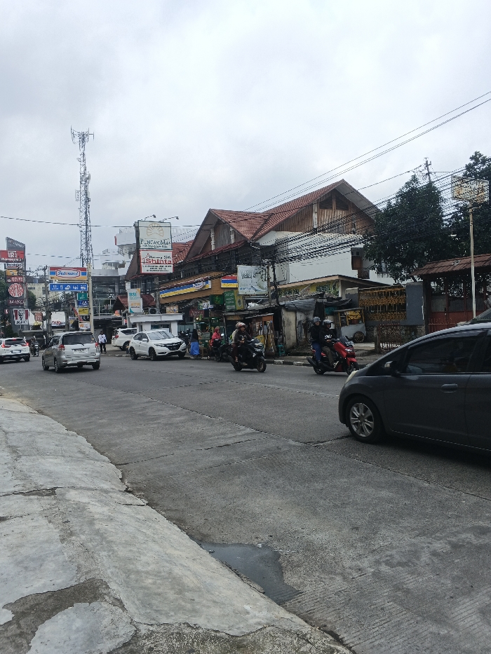The image presents a daytime street scene in Sariaya, Philippines, under an overcast sky. The foreground shows a concrete sidewalk and curb, with a small puddle on the adjacent asphalt road. The midground features a multi-lane paved road with vehicular traffic. A dark grey hatchback occupies the lower right, partially visible. Further down, a silver minivan and a white SUV are observed, along with at least three motorcycles. Two individuals on motorcycles are visible, wearing helmets; one on a red scooter and another on a black motorcycle. Several pedestrians are present on the sidewalks adjacent to the buildings. The background comprises a row of commercial buildings, one prominent structure featuring a red-tiled, multi-pitched roof and light-colored wooden siding on its upper levels. Numerous commercial signs are visible, including those for Indomaret, KFC, Bank BSI, Pintar Mart, and Ishinta. A tall cellular tower is prominently positioned on the left side of the street, and utility poles with overhead power lines traverse the scene. Trees are visible on the right side, partially obscuring a structure.