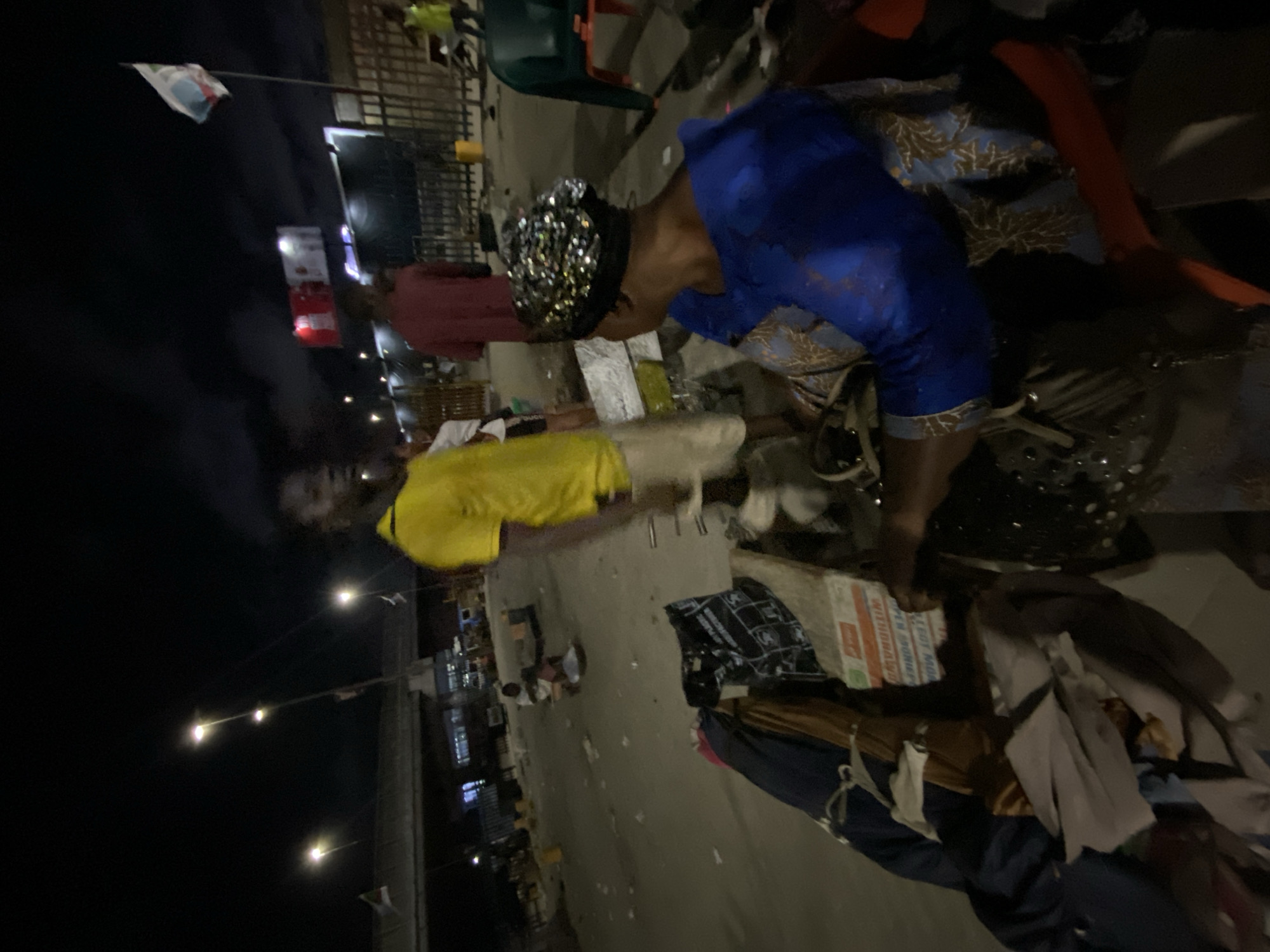 n outdoor scene at night, likely in the city of Lekki, Nigeria, based on architectural and cultural visual cues. People are present, including one woman wearing a blue patterned top and a sequined head covering. Another person is wearing a yellow shirt. There are various objects scattered around the scene including boxes and fabrics, suggesting a market stall or possibly a display of goods. A green chair is also visible. The scene is lit by streetlights in the background. The overall environment appears to be a busy urban area at night.