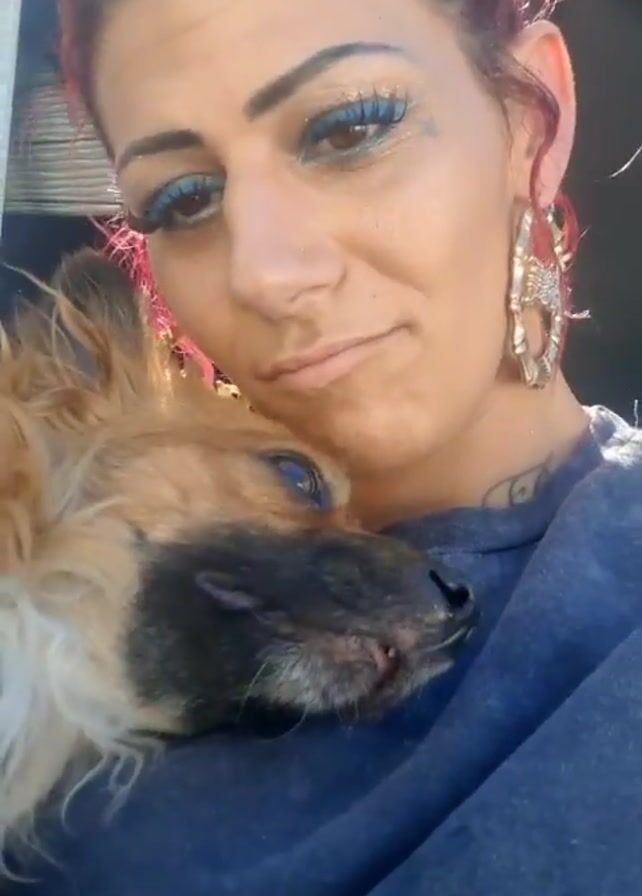 A woman with red hair, heavy blue eye makeup, and large earrings holds a small dog in her arms