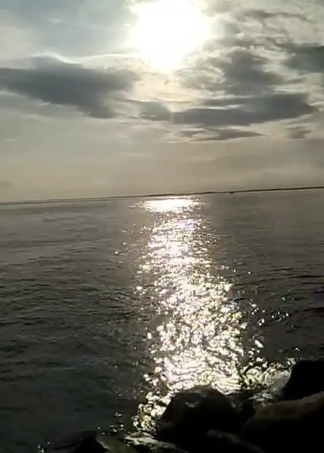 view of water, possibly the ocean, from a rocky shoreline. The sun shines brightly through the clouds, creating a glistening path of light across the water's surface. The sky is partially covered with clouds, and the water is dark. There are no people visible in the video. The camera remains static throughout the clip.