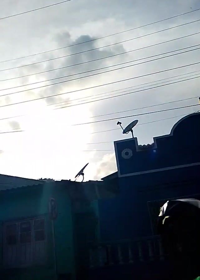The video starts with a low-angle shot of a blue building with the word "RICARDA" visible on its upper portion. The sky is partly cloudy with visible power lines. A person wearing a helmet and a green shirt is seen riding a motorcycle. The camera then pans to show a yellow car driving down a street lined with buildings and trees. The video ends with a blurry close-up of a dark, undefined object.