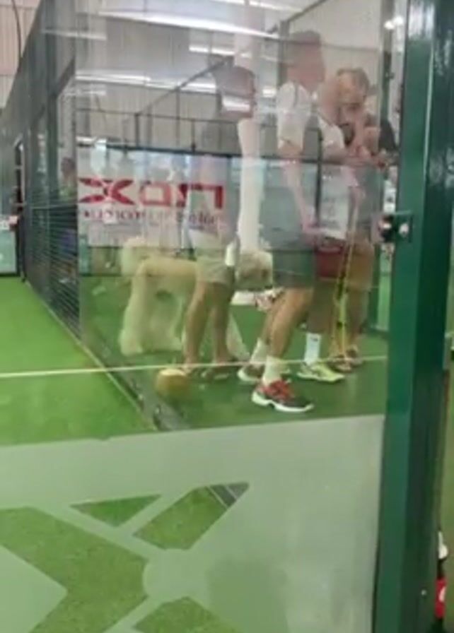 A blurry video from behind a glass barrier shows a group of men and a fluffy white dog on a green sports court