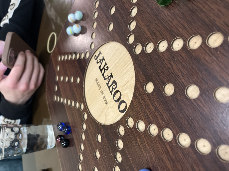 An indoor scene, presumably in Homs, Syria, given the "MADE IN SYR" text on the game board. The primary subject is a dark brown wooden Jakaroo board game, featuring a lighter circular wood inlay in the center. The inlay reads "JAKAROO" in black capital letters, with "MADE IN SYR" printed above it. The board has numerous circular indentations forming paths for game pieces. Marbles are present on the board: four dark blue and two black marbles are clustered on the left side, while four light blue/white marbles with subtle swirls are grouped on the right side. A single green marble is partially visible in the bottom right corner, and a single blue marble in the bottom left. In the upper portion of the image, the hands and forearms of a person are visible, wearing a black long-sleeved garment with a white patterned stripe on the right sleeve. The person is holding a brown-cased smartphone in their right hand, appearing to be interacting with it. A clear glass of water rests on the dark brown table surface to the left of the person's hands. A light-colored elastic band lies on the table to the right of the smartphone.