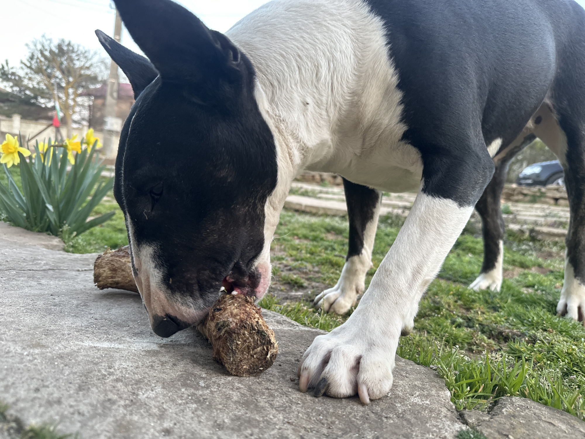 A black and white Bull Terrier dog is depicted in a ground-level, close-up shot, actively chewing on a cylindrical, soil-encrusted organic object, approximately 15-20 cm in length, which rests on a textured grey concrete surface. The dog's muzzle is firmly pressed into the object, exposing pink gum tissue. Its coat is predominantly black, with significant white markings on its chest, underbelly, and paws, and white around its muzzle. To the left in the midground, a cluster of yellow daffodils with green foliage is visible next to the concrete. The background shows an outdoor environment consisting of green grass, blurred distant bare deciduous trees, and indistinct structures. A Bulgarian national flag (white, green, red horizontal stripes) is discernible on a pole in the far background, confirming the location in Kavarna, Bulgaria.
