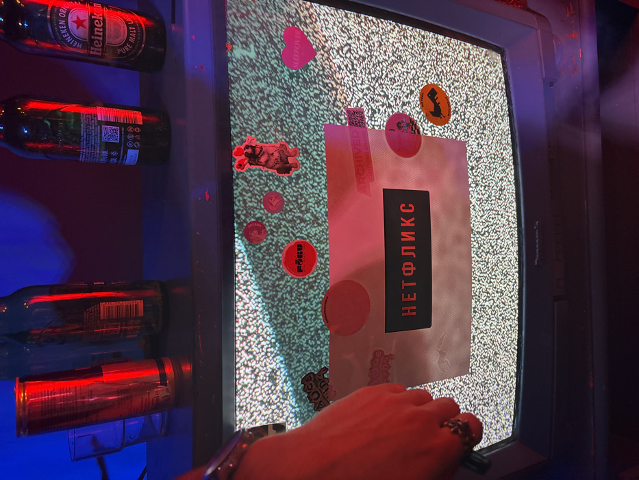 The image displays an interior scene within FÖKU club in Sofia, Bulgaria, illuminated by strong red and blue ambient lighting. In the foreground, a vintage CRT television screen exhibits white and black static. Numerous stickers are affixed directly to the screen. A prominent black rectangular sticker in the center displays "НЕТФЛИКС" (NETFLIX in Cyrillic) in red letters. Above this, a red circular sticker reads "FÖKU", flanked by two smaller pink circular stickers. To the right, a cartoon dog sticker with heart-shaped ears is visible, alongside a pink heart-shaped sticker labeled "SLEEPOVER". In the lower right of the screen, an orange sticker features an elongated animal and text including "HAPPY NEW YEAR". Other smaller, less distinct stickers are also present, including one that mentions "ARCHIVED CLOTHING BRAND". A human left hand, wearing two rings (one on the index finger, one on the middle finger) and a silver-toned bracelet, enters the frame from the lower left, partially obscuring the television's bezel and screen. Above the television, on a dark shelf, several beverage containers are arranged. From left to right: a clear glass containing a small amount of liquid, an empty red aluminum can (suggestive of an energy drink), an unidentifiable dark glass bottle with a barcode visible, and a green glass bottle prominently displaying a "Heineken Pure Malt Lager" label. The red lighting intensely reflects off the aluminum can, the bottles, and the visible hand, while the upper background is washed in a purple-blue hue.