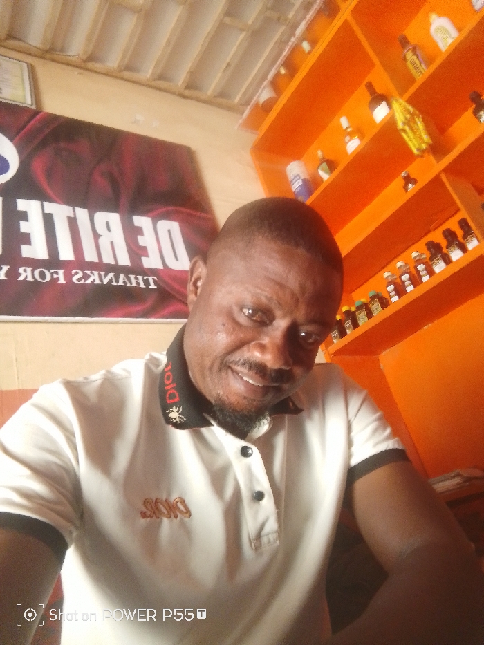 The image portrays a male individual in an indoor commercial setting located in Sabon Tasha, Nigeria