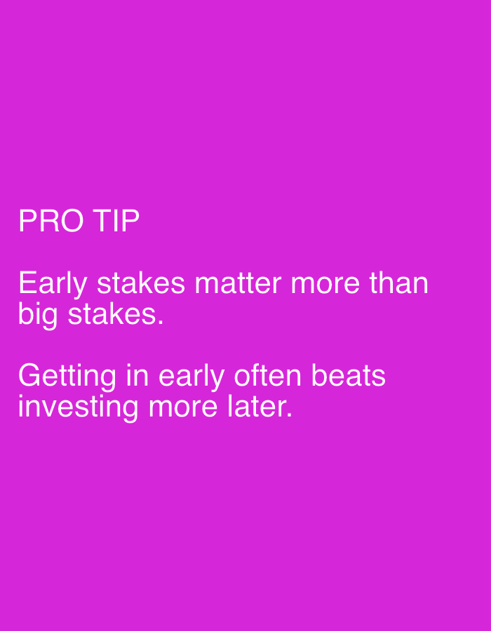 A magenta square presents a "PRO TIP" encouraging early investments. The phrase "Early stakes matter more than big stakes" suggests prioritizing initial participation over larger investments later. An additional line reinforces this idea, stating that "Getting in early often beats investing more later." The image conveys the value of early adoption or initial commitment in investment strategies.